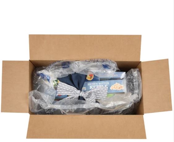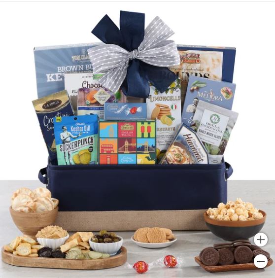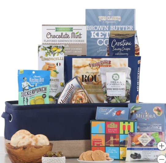 | moreIncludes: 1.40 oz. Ahmad Tea English Tea No. 1 (Indonesia) 13.00 oz. Harrington’s Chocolate Mint Sandwich Cookies (USA) 3.00 oz. Original Flavor Hummus (USA) 0.85 oz. Lindt Lindor Milk Chocolate Truffles (USA) 2.11 oz. Meliora Garlic & Herb Bruschette (Italy) 6.00 oz. Tom Clark Brown Butter Kettle Corn (USA) 4.00 oz. Valley Lahvosh Sesame Rounds Crackers (USA) 3.50 oz. Bella Campagna Whole Mixed Olives (Peru) 4.23 oz. La Spiga Crostini Savory Crisps with Rosemary (Italy) 7.05 oz. Panearte Limoncelli Cookies (Italy) 3.40 oz. SuckerPunch Classic Kosher Dill Pickles (USA) 1.06 oz. Sunny Fruit Organic Dried Plums( Turkey) Canvas and Burlap Basket 18×8.5×7” Opaque Ribbon 2.5” Opaque and Metallic Ribbon 2.5” Gift Size: 17.75×8.75×13.75