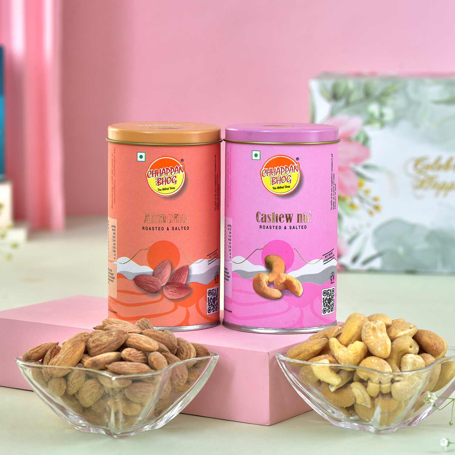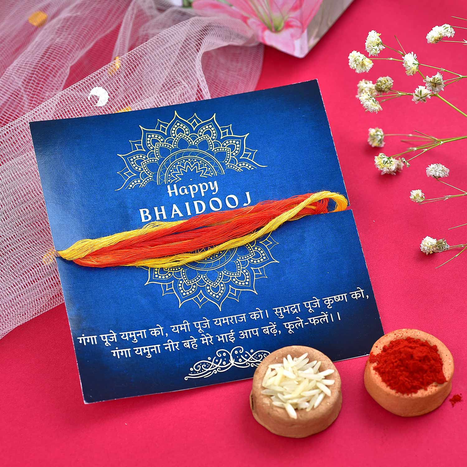 | * Chhappan Bhog Almond Can 100gms. * Chhappan Bhog Cashew Can 100gms. * Galaxy Fusion Dark chocolate 20gms. * Yardley London Gentlemen Perfume 20ml. * Celebration Box. * Roli Tikka with Red Thread. * Bhai dooj Message Card. |