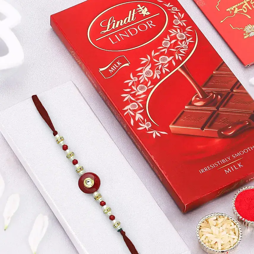 RMTDCRSSNLXXX000250–Beads Rakhi FES-0000115-1 RMTDCRSSNLXXX000106-FESROC004-Roli Chawal-1 RMTDCRSSNLXXX000040-CONWPR169-Envelop Rakhi W Card-1 RMTEDBCONFXXX000081-EDBCHC078-Lindt Lindor (Swiss Milk Chocolate With A Smooth Melting Filling) 100G-1